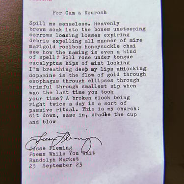 Typewriter poems bring whimsy and nostalgia to any event! Atypical Poetry can be found at farmers' markets, cocktail hours, street festivals, writers' nights, weddings, and more.